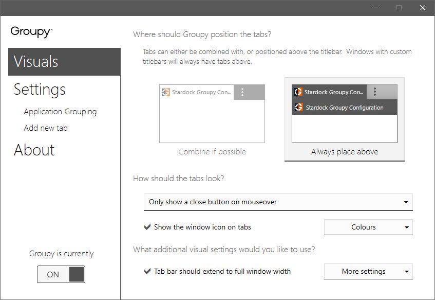 「Stardock Groupy」一款可以把软件窗口就会自动整合到一起,每个窗口都会自动转换为标签页,只需要在标签页点击不同的标签,即可切换程序。