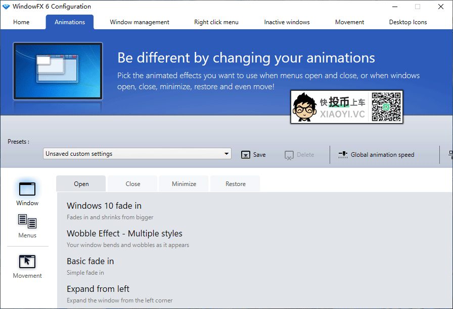 如果你用过 MacOS / Ubuntu 应该知道窗口最大化/最小化会有动画效果,窗口各种Duang~Duang!而「WindowFX」一款可以给你的Windows窗口添加动画的软件。