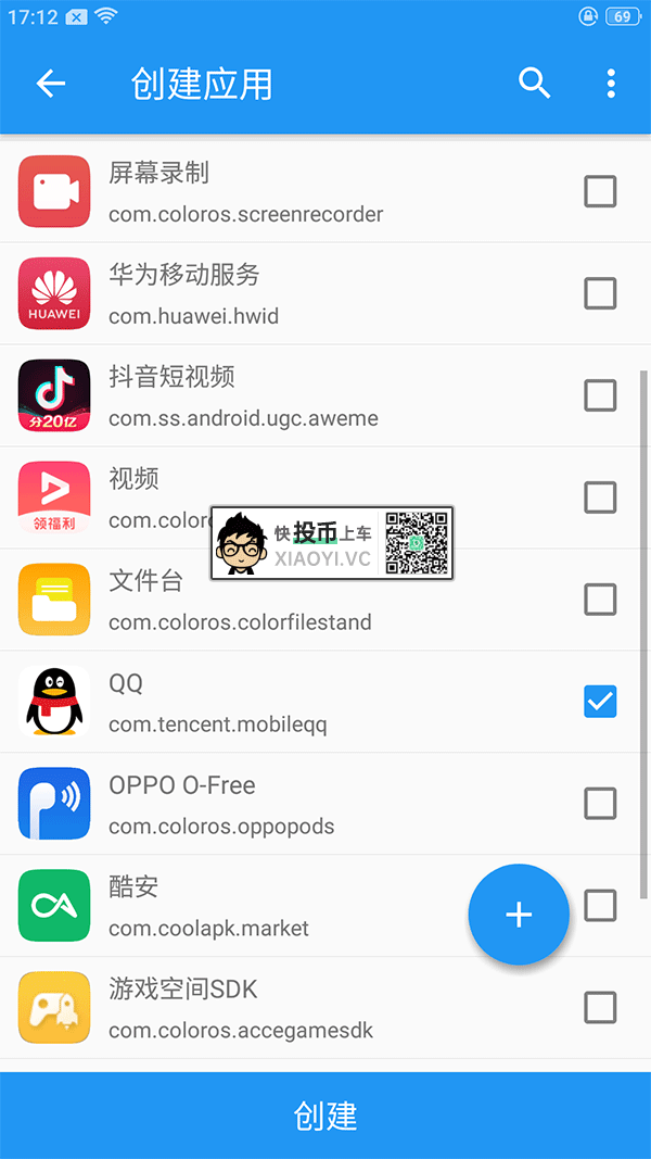 2.添加你需要使用模块的APP,例如扣扣。点创建后会提示卸载扣扣,需重新安装,这时候会把扣扣安装到「太极」的单独层里面。请耐心等待创建完毕。