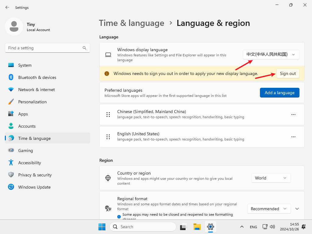 - 下载好后,Language & region - Windows display Language - 选择中文,之后注销或者重启系统生效。