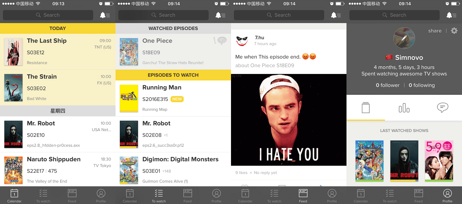 - 个人简介:可显示已观看剧集数时间、最近观看和所有追踪的电视节目、观看统计和发表的评论