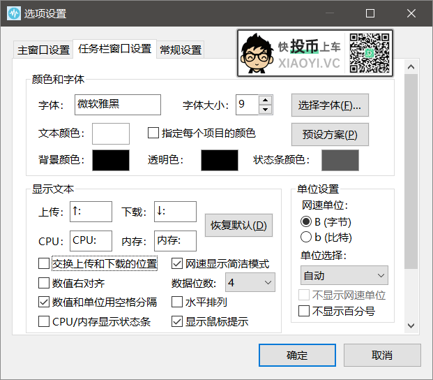 SoftGoing还是喜欢嵌入到任务栏显示模式,不喜欢桌面有多余的悬浮东西显得很突兀,任务栏模式同样提供了很丰富的个性化设置功能,可以设置背景颜色、字体大小和颜色、文本内容、状态条等。