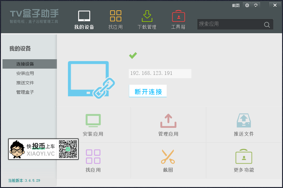 使用「TV盒子助手」需要智能电视/盒子 允许开启“ADB”调试功能,开启后点击 自动扫描设备 或者 手动输入电视机IP地址就可以连接上了。