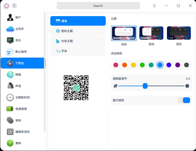 通过UOS个性化设置,你可以设置透明度:调节启动器(小窗口模式)、任务栏的透明度;还可以设置系统主题、活动用色、字体、窗口特效等,改变桌面和窗口的外观,设置成您喜欢的显示风格。