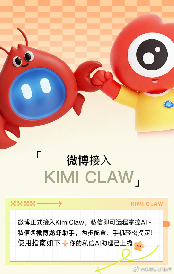 之前分享过月之暗面 Kimi 发布了 Kimi 云端 OpenClaw (Kimi Claw),开箱即用,据介绍把 OpenClaw 框架与自家旗舰模型 Kimi K2.5 整合。现在微博宣布接入 Kimi Claw,用户关注 @微博龙虾助手 并发送私信,即可远程连接与控制 AI 智能体。