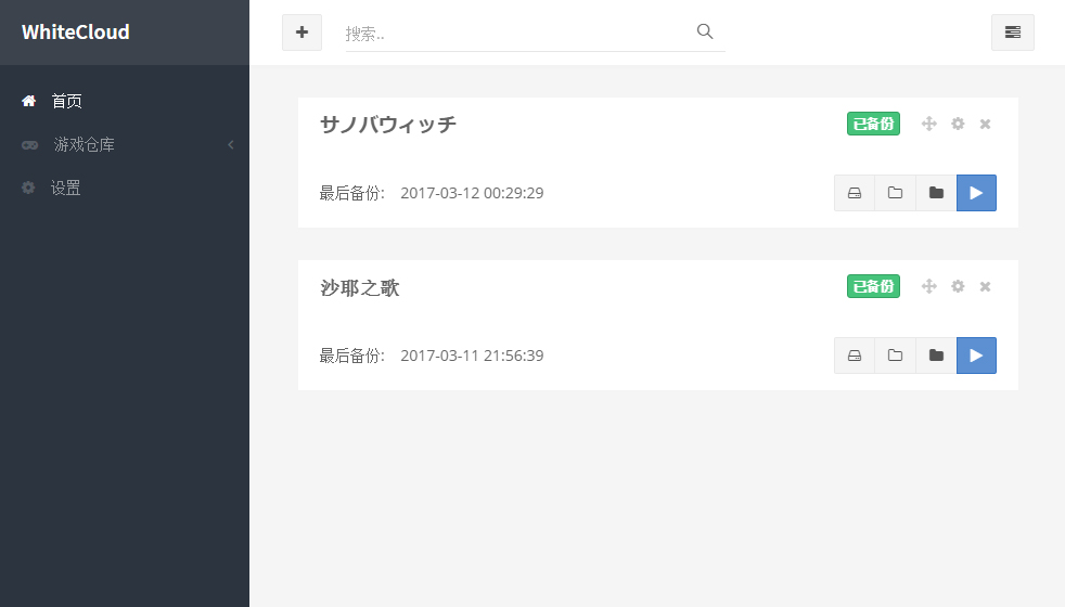 首先当然是核心功能,存档的备份管理,任何一个游戏的备份都会上传到服务器,这样在任意电脑上只要装了「Whitecloud」和游戏本地,就能随时随地还原进度啦。注册后提供 20MB 的免费空间,用来放存档。