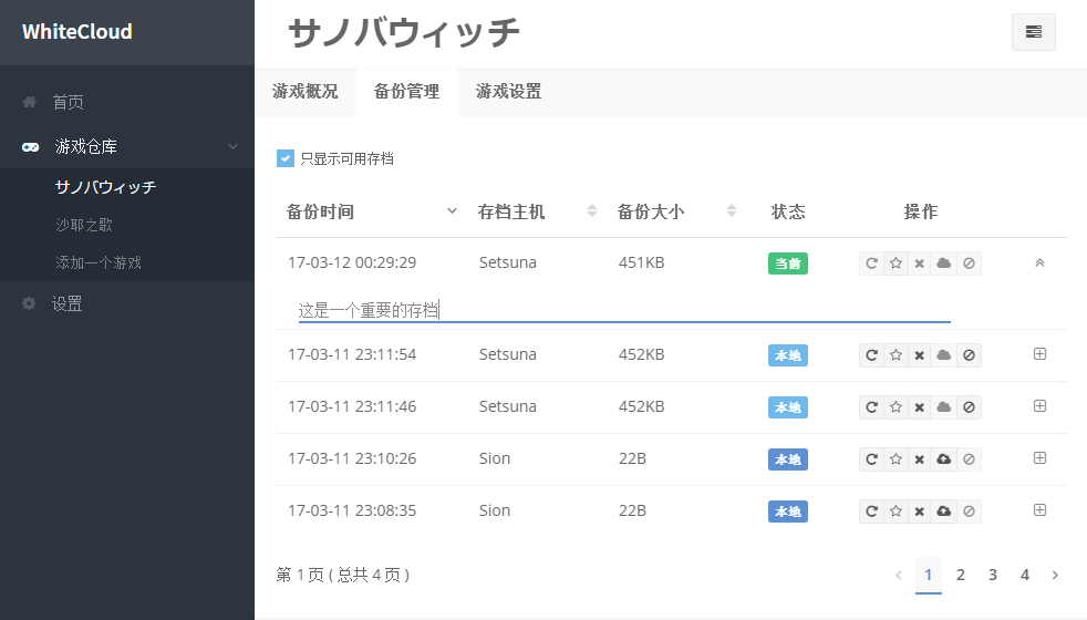你可以查看任何游戏的备份历史,给重要的备份写上注释信息,并收藏它。或是一不小心错误覆盖了重要存档,可以通过「Whitecloud」回滚到上一个备份。