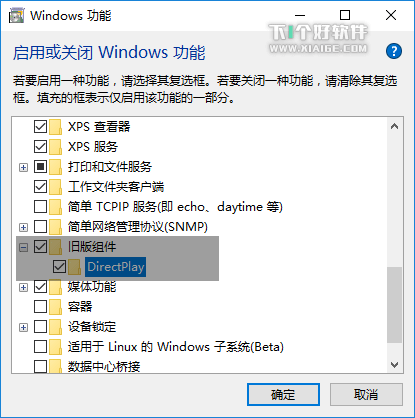 快捷键:Win Q,输入:启用或关闭Windows功能,然后在Windows功能中找到“旧版组件”,展开,勾选“DirectPlay”功能,点击“确定”