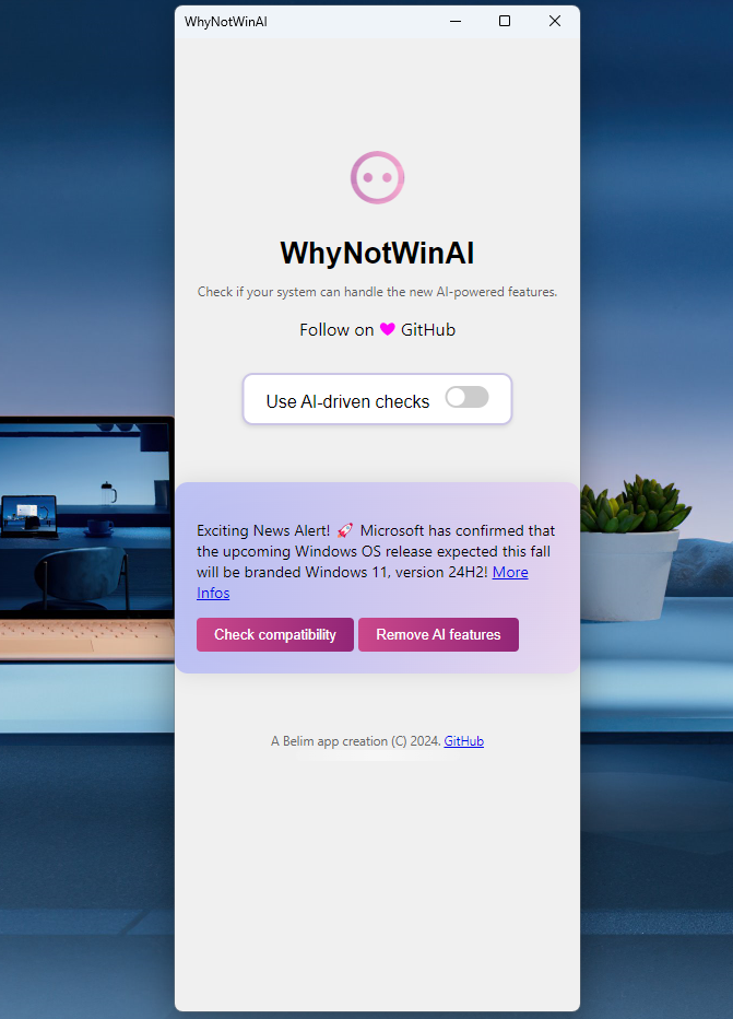 另外在 Github 上还有开发者制作了「WhyNotWinAI」工具,同样是用来检测你的电脑是否符合升级 Win11 24H2 版本。