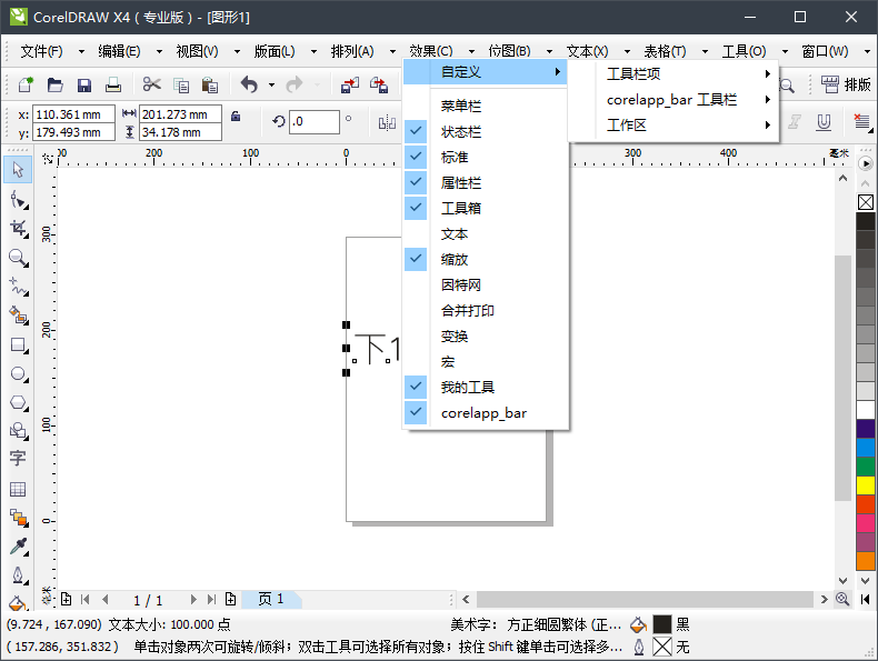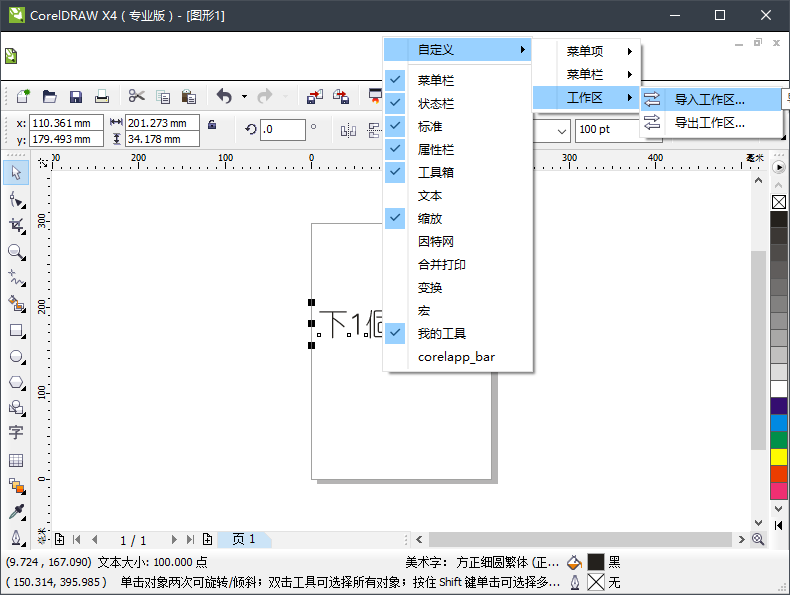 下载 CorelDraw X4/X5/X6的菜单工作区,以 CorelDraw X4 版本为例:打开后在 工具栏右键 → 自定义 → 工作区 → 导入工作区 → 选择相应的工作区。