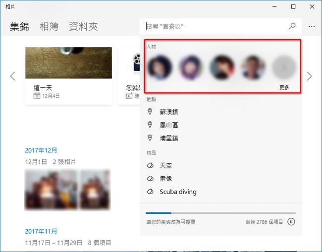如果有将相片储存在微软的 OneDrive 云端空间,建议你可以使用内建在 Windows 的“相片”应用程式来进行管理,除了可制作相片与影片的混合影片外,针对相片的搜寻,除了常见的文字之外,还会自动整理相片中的人物,更自动将头像识别在搜寻栏内,让人脸辨识搜寻也能轻而易举。
