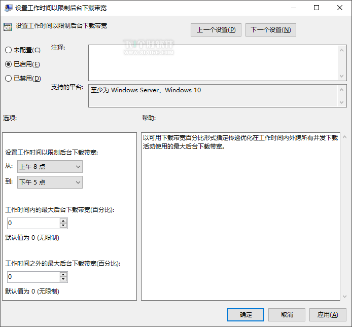在此,您可以自己指定工作时间段的起始和结束时间,并配置工作时间段内、外最大后台下载带宽的百分比。