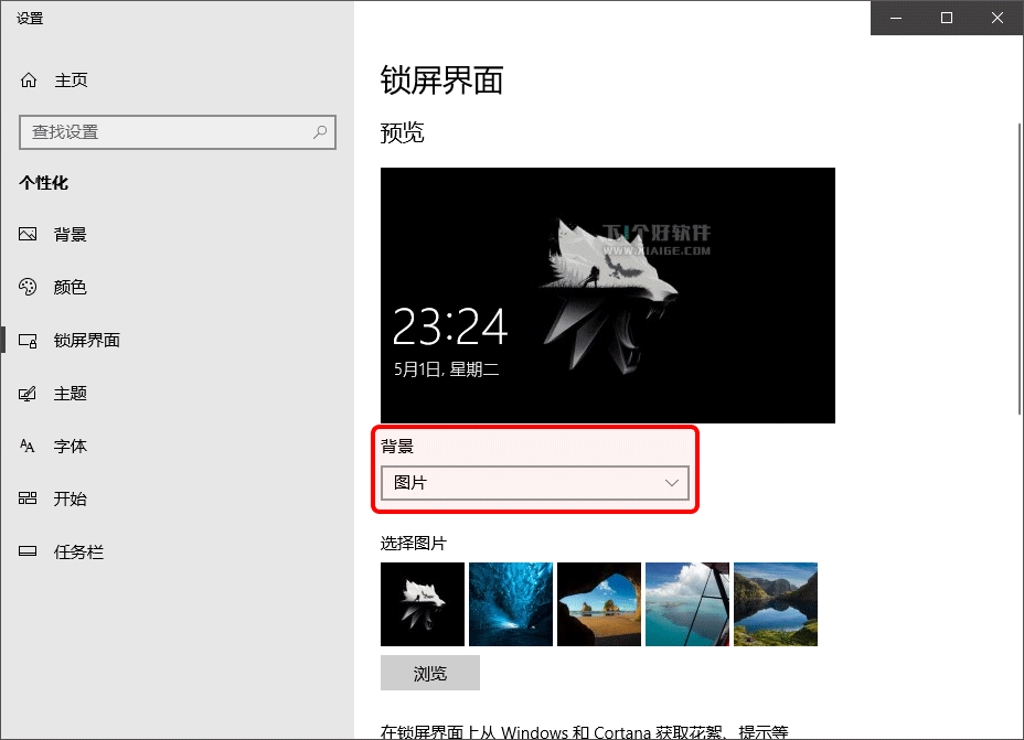 1桌面右键 → 个性化 → 锁屏界面 → 把 [背景] 改为 [图片]