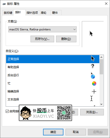 可以直接安装「MacOS」样式的鼠标指针,右键 "Install.inf" 文件安装,然后在设置 → 设备 → 指针选项,选择指针样式。