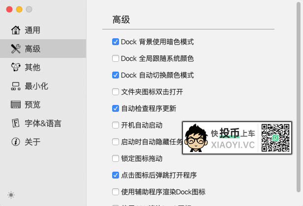 「MyDock」设置功能上支持调整图标大小、自定义替换图标、使用暗色模式、最小化动画效果、模糊效果、字体设置等等。