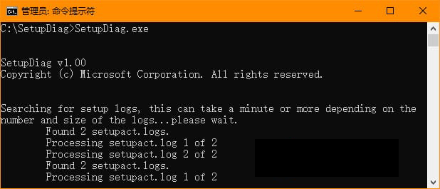 命令执行完扫描后,会在 SetupDiag.exe 工具的相同目录下生成一个名为 SetupDiagResults.log 的结果文件,其中会包含在升级日志文件中检测到的升级问题。与此同时,还会在同一目录下创建一个所有日志文件的 Logs.zip 打包存档。