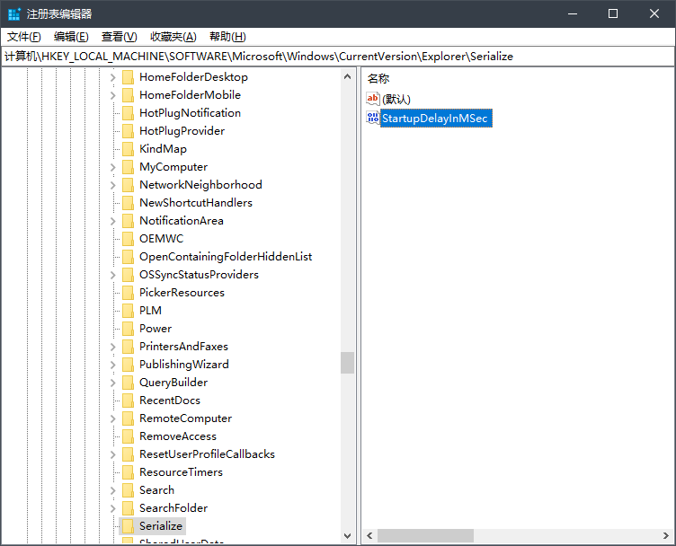 在 Serialize 项下创建一个名为 StartupDelayInMSec 的 32 位 DWORD 值,然后数值设置为 0