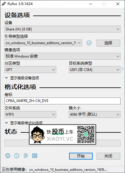 2.「Rufus USB」分区类型选择 "GPT",目标系统类型选择 "UEFI"。族大小默认 "4K对齐",然后点开始制作UEFI启动安装盘。