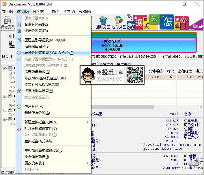 磁盘转换GPT有多种方法,例如到PE模式下,使用CMD命令 "convert gpt" 来转换,但是这种会导致数据全部丢失。这里SoftGoing推荐用「DiskGenius」软件无损转换。