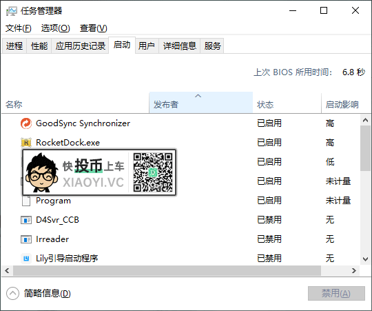 安装完毕后,可以在"任务管理器" → "启动" 查看启动时间,SoftGoing的启动时间是6.8秒。