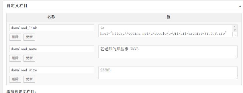 输入download_name,然后右侧输入文件的名字,比如:苍老师的那些事.RMVB,继续输入自定义栏目 download_size,然后右侧输入文件的大小,比如:233MB,然后继续输入自定义栏目 download_link,然后右侧输入文件的下载链接,注意,这里需要输入的是A标签代码,比如:点击下载