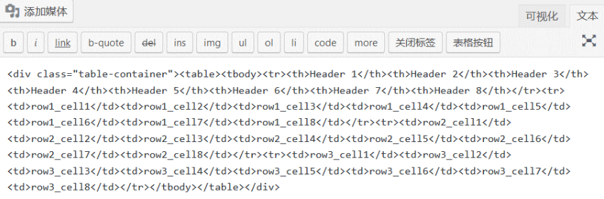 QTags.addButton( 'tables', '表格按钮', '<div class="table-container"><table><tbody><tr><th>Header 1</th><th>Header 2</th><th>Header 3</th><th>Header 4</th><th>Header 5</th><th>Header 6</th><th>Header 7</th><th>Header 8</th></tr><tr><td>row1_cell1</td><td>row1_cell2</td><td>row1_cell3</td><td>row1_cell4</td><td>row1_cell5</td><td>row1_cell6</td><td>row1_cell7</td><td>row1_cell8</td></tr><tr><td>row2_cell1</td><td>row2_cell2</td><td>row2_cell3</td><td>row2_cell4</td><td>row2_cell5</td><td>row2_cell6</td><td>row2_cell7</td><td>row2_cell8</td></tr><tr><td>row3_cell1</td><td>row3_cell2</td><td>row3_cell3</td><td>row3_cell4</td><td>row3_cell5</td><td>row3_cell6</td><td>row3_cell7</td><td>row3_cell8</td></tr></tbody></table></div>' );