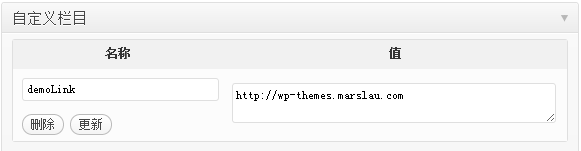 <?php echo get_post_meta( $post -> ID , “demoLink” , true ) ; ?>其中”demoLink”是自定义栏目的名称。