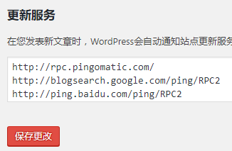 WordPress 更新服务功能(Ping)可以通知 搜索引擎,告诉你的网站更新内容了,让搜索引擎加快收录,只要在「后台」→「设置」→「撰写」→「更新服务」里面添加如下的地址: