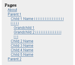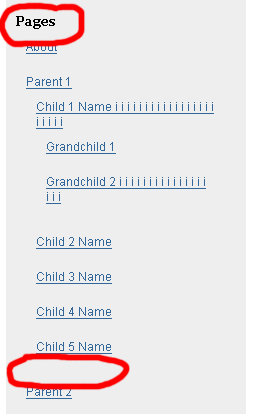 这就是我的页面链接的样子。可能默认安装下的 WordPrss 只有一个链接:About。我的离线 WordPress 增加了多重页面链接是为了测试最低级别的链接看起的样子,注意到我已圈出在底部有不必要额外的填充,这是一个非常好的关于样式继承的例子。这里不是10像素而是20。