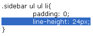 }在 .sidebar ul ul li{} 中连续的 UL 指明了我们是在定义第二级别的 LIs。再说一次,当所有的值都为 0 的时候,你不需要 px 这个后缀。