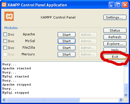 最后不要忘记关闭 Xampp,双击它在任务栏中小图标,点击 Apache 和 MySQL 的停止按钮,然后点击推出。