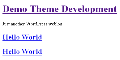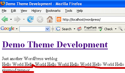 保存 index.php 文件并刷新浏览器,这时候应该看到在博客描述的下方出现 Hello World ,默认安装 WordPress 之后,博客只有一篇日志,而我的测试站点有多篇日志,所以这里有多个日志标题,而且因为我所用的日志标题是一样的,所以它们看起来像很长的一行 Hello World。