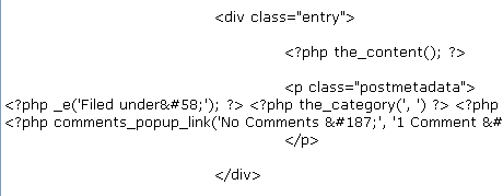 - <?php _e(‘by’); ?> – 和 Filed under:一样。如果你创建的是私人用的的主题, by 外面的 _e() 不是必须的。_e() 是用来创建可以翻译的主题,如果主题被来自不同国家的上百人使用的话,这是非常重要的。如果你是创建公共使用的主题,最后加上 _e() 以便你的主题可翻译化。