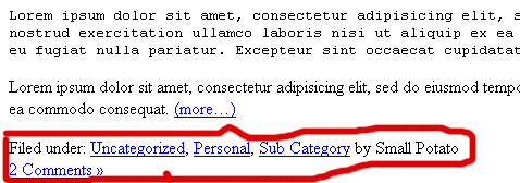 - <p class=”postmetadata”> 和 </p> – 所有的日志元数据都在一个 class=”postmetadata”的段落标签中,因为我们要把日志元数据和日志内容区分开,如果没有段落标签,日志元数据信息将在日志内容结束的地方继续,这样就没有任何间距去区别内容和日志元数据。