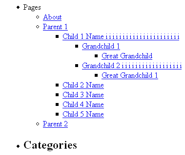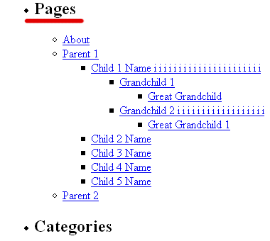在上面的截图中,注意到“Pages”这个列表标题和“Categories”这个分类链接标题的大小不一样。