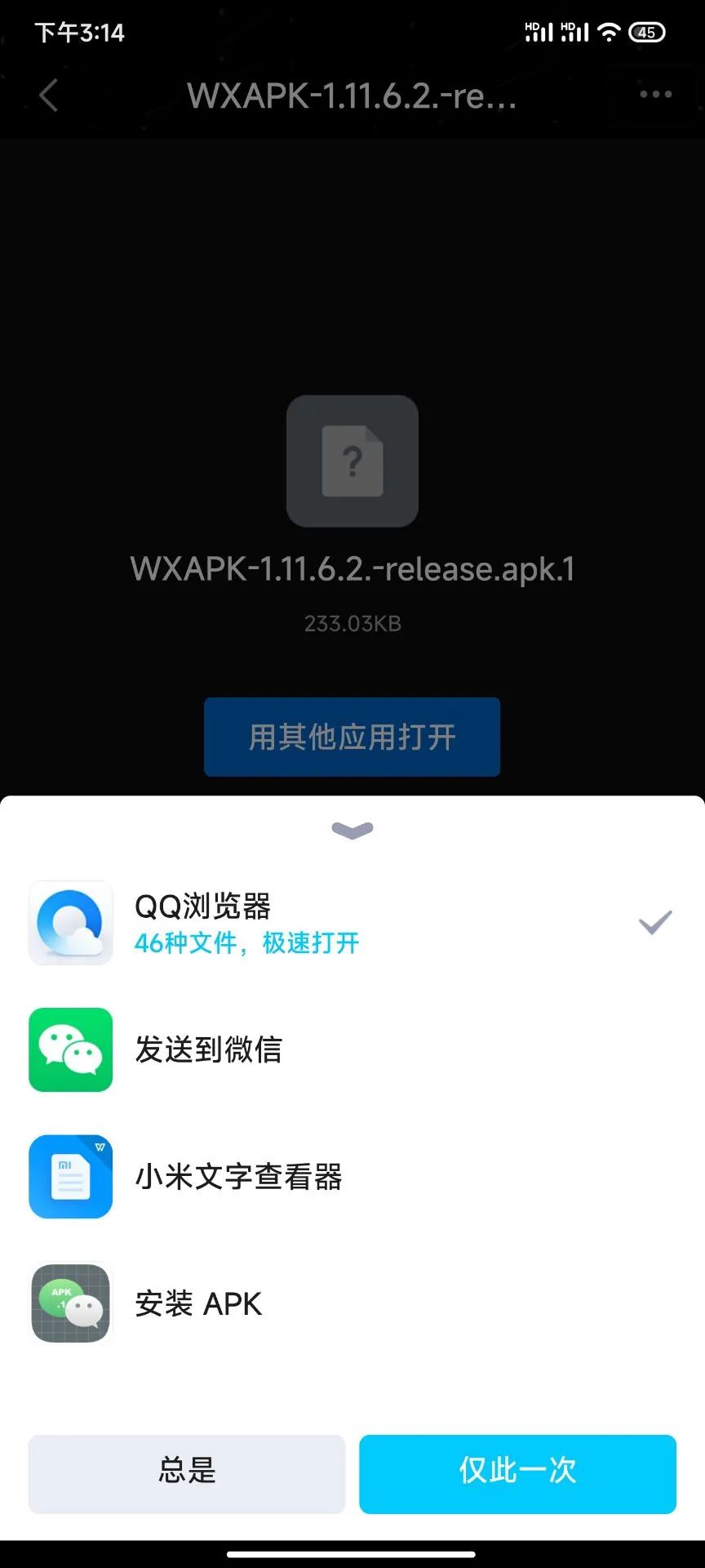 安装好 WXAPK 后,现在安装 apk.1 文件点击 - 用其他应用打开 - 然后选择 WXAPK(安卓 APK) 应用。