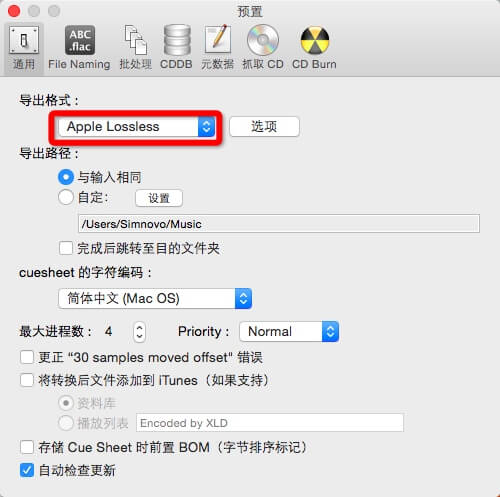 打开X Lossless Decoder偏好设置,选择导出格式为Apple Lossless,