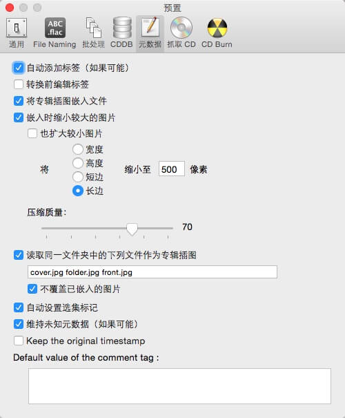 如果你希望转换后的音频包含完整的歌曲信息(包括歌手、专辑、专辑插图等),还需查看元数据标签页设置是否如下图所示,